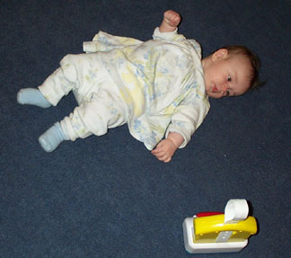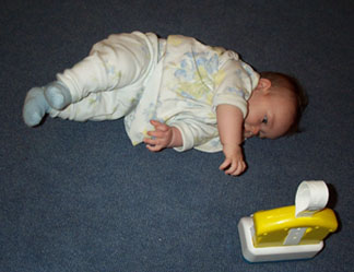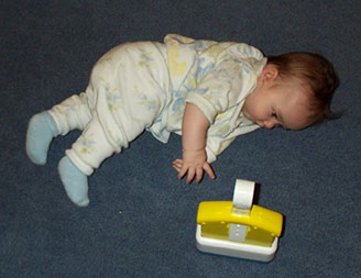 Step 1: Julia sees a toy placed just out of her reach to one side. She turns towards it and tries to grab it with the arm closest to it.
